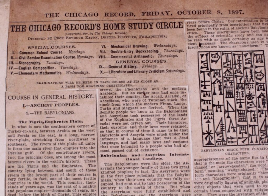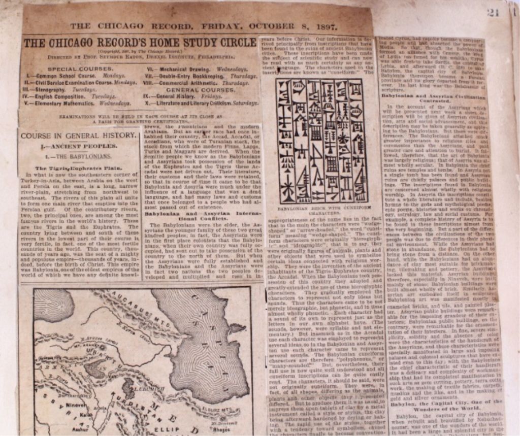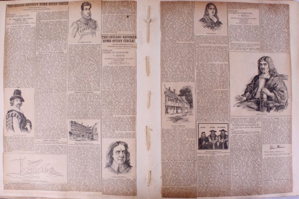 This lot features a collection of clippings from the "Chicago Record's Home Study Circle". These lessons in science, math, and literature reached the masses in the late 1800's, providing thought and insight tothose who may be otherwise isolated. This book measures 12" x 14.5".