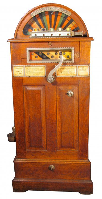 Chicago Ridge Gambling Machine, ca. 1897. Paul E. Berger Mfg. One of the earliest floor model slots. Very good original condition. 28 X 57 X 14 inches.