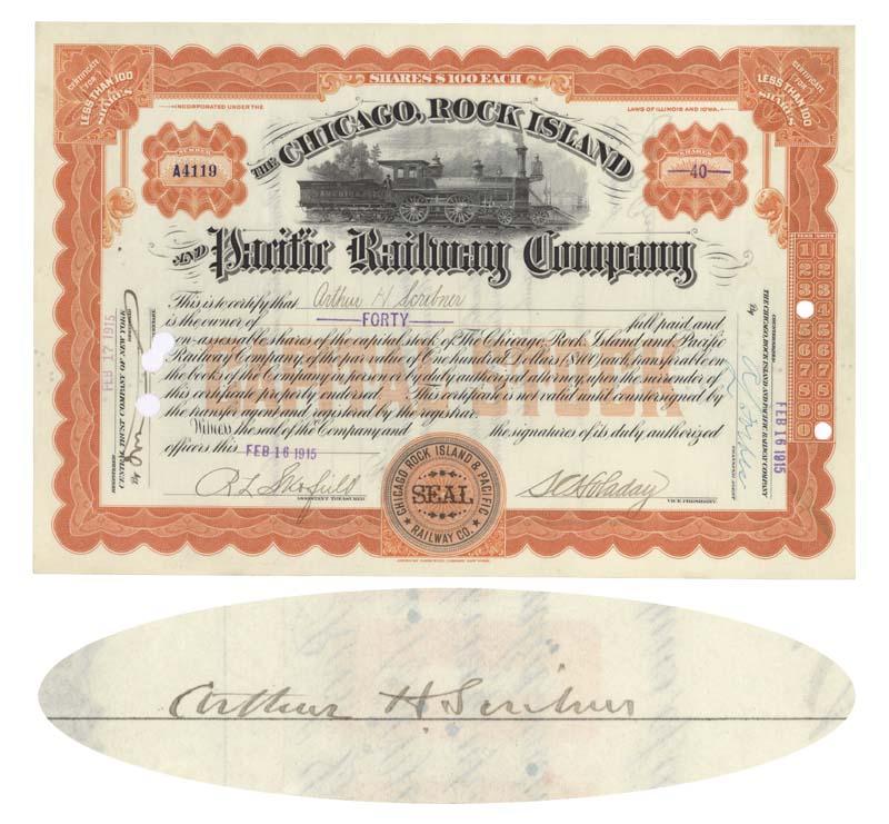 1915, Illinois. Stock certificate for 40 shares. Orange/Black. Vignette of a steam locomotive at top center. Issued to and signed on verso by Arthur H. Scribner (1859-1932). Publisher. Extremely Fine. Punch cancellations not affecting Scribner's signature.