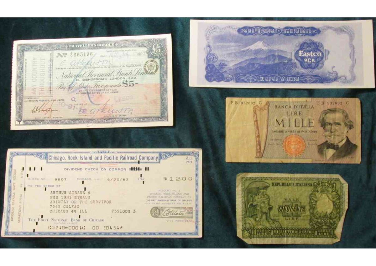 "Chicago, Rock Island and Pacific Railroad Company…Dividend Check on Common stock", cancelled; "Nippon Ginko Eastco RCA 100 Yen" Japanese note; Italy 50 Lire Banknote, VG; Italy 1000 Lire Banknote, Fine; & 5 Pound Traveller's Checque "National Provincial Bank Limited...London"