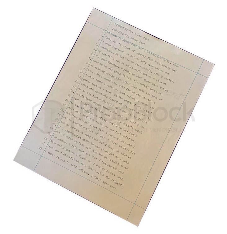 Defense statement used in the production of the 2002 musical film Chicago. Two death-row murderesses develop a fierce rivalry while competing for publicity, celebrity, and a sleazy lawyer's attention. This statement was used by the character of Roxie Hart, actress Renee Zellweger and remains in excellent, production used condition.