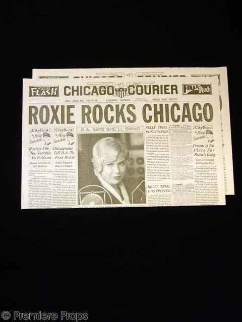 CHICAGO - Set of Two “Roxie Rocks Chicago” Headlines - A valuable collectors' set consisting of two front page to a vintage edition of the “Chicago Courier” newspaper! These 17” x 11 3/8” front pages are printed in black and white on gray newsprint, featuring the bold headline “Roxie Rocks Chicago!” There is a sinister portrait of Roxie (RENÉE ZELLWEGER) making her public plea in the center of the paper, headed by the claim “D.A. Says She'll Swing!!” There are two other articles on the front page of the folded newspaper, both relating to Roxie and her trial. Don't pass up this beautiful and pristine set of authentic MIRAMAX movie history!!
