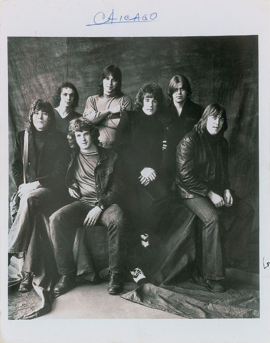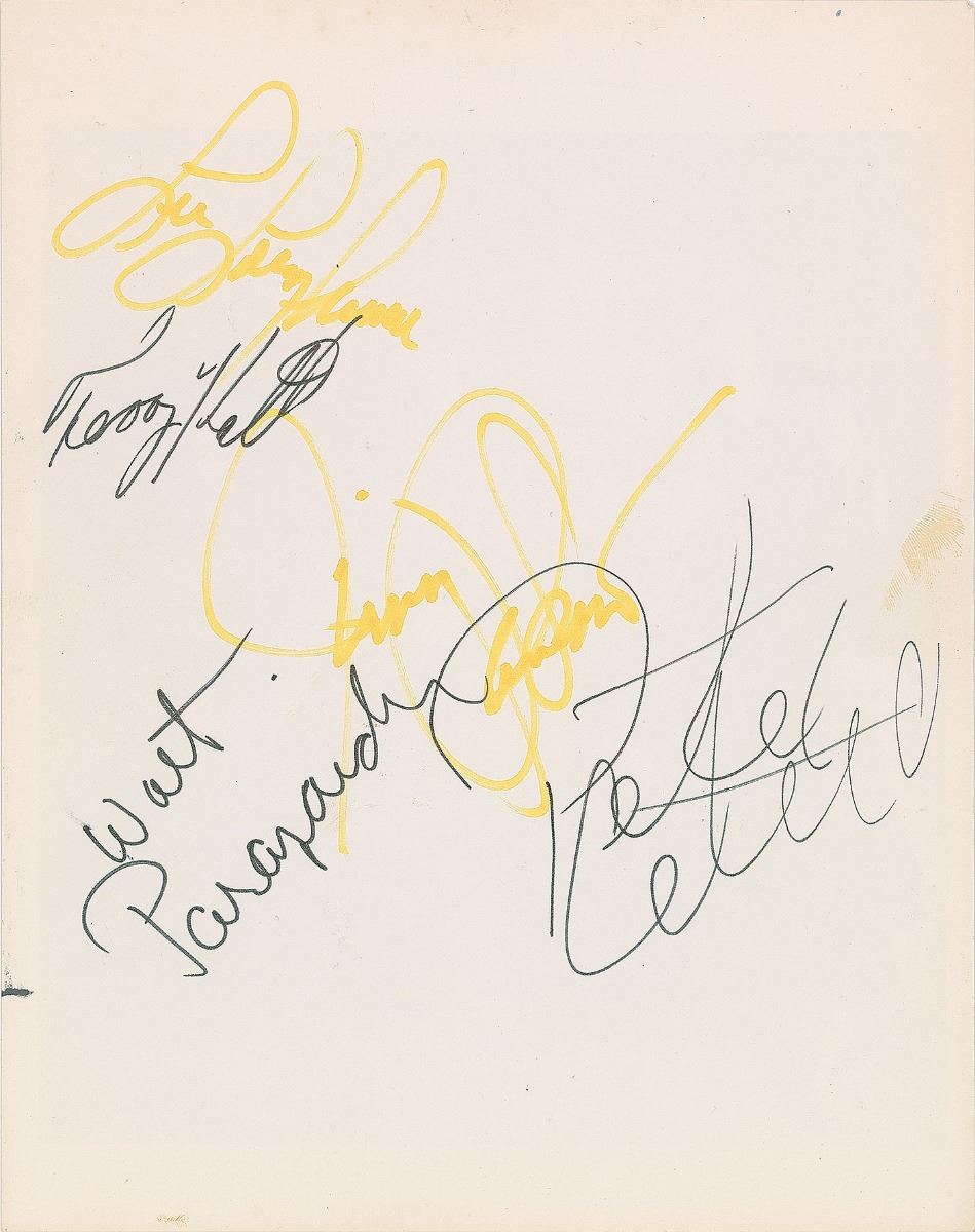 Glossy 7 x 9 group photo of Chicago, signed on the reverse in black felt tip by Peter Cetera, Terry Kath, and Walter Parazaider, and in yellow felt tip by Jimmy Pankow and Lee Loughnane. Includes an after show guest pass for the band’s 1984 tour, 3 x 4, dated October 12, 1984, signed in ballpoint by Danny Seraphine and Robert Lamm, who adds “Chicago,” affixed to an off-white 8.25 x 11 magnetic photo album page. In overall fine condition, with a small fingerprint part to right edge and fading to two signatures.