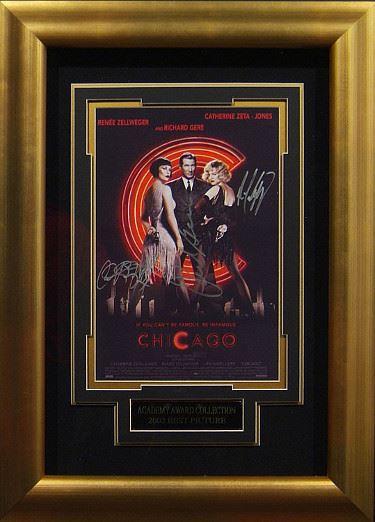 Chicago is a 2002 American musical comedy crime legal drama based on the musical of the same name, exploring the themes of celebrity, scandal, and corruption in Chicago during the Jazz Age. The film stars Catherine Zeta-Jones, Renee Zellweger and Richard Gere. Chicago centers on Velma Kelly (Zeta-Jones) and Roxie Hart (Zellweger), two murderesses who find themselves in jail together awaiting trial in 1920s Chicago. Velma, a vaudevillian, and Roxie, a housewife, fight for the fame that will keep them from the gallows. Chicago won six Academy Awards in 2003, including Best Picture. The film was critically lauded, and was the first musical to win Best Picture since Oliver! in 1968 This is an signed Publicity Masterprint 11x17 inch movie poster with museum Quality Custom Gold Framing as shown to an overall size of 22x30. Catherine Zeta-Jones, Renee Zellweger and Richard Gere have hand signed this poster. The perfect addition to complement any Home Theater Collection. Witnessed, Examined, and Certified Authentic (Lifetime) by Millionaire Gallery, Inc.