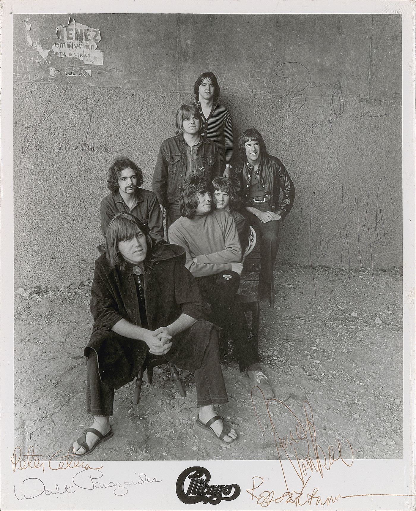 Rare and desirable vintage glossy 8 x 10 publicity photo of the classic 'rock with horns' band Chicago, signed in ballpoint by Peter Cetera, Terry Kath, Walter Parazaider, Danny Seraphine, Lee Loughnane, James Pankow, and Robert Lamm. In fine condition, with light surface impressions from another photo that was signed on top of this one.