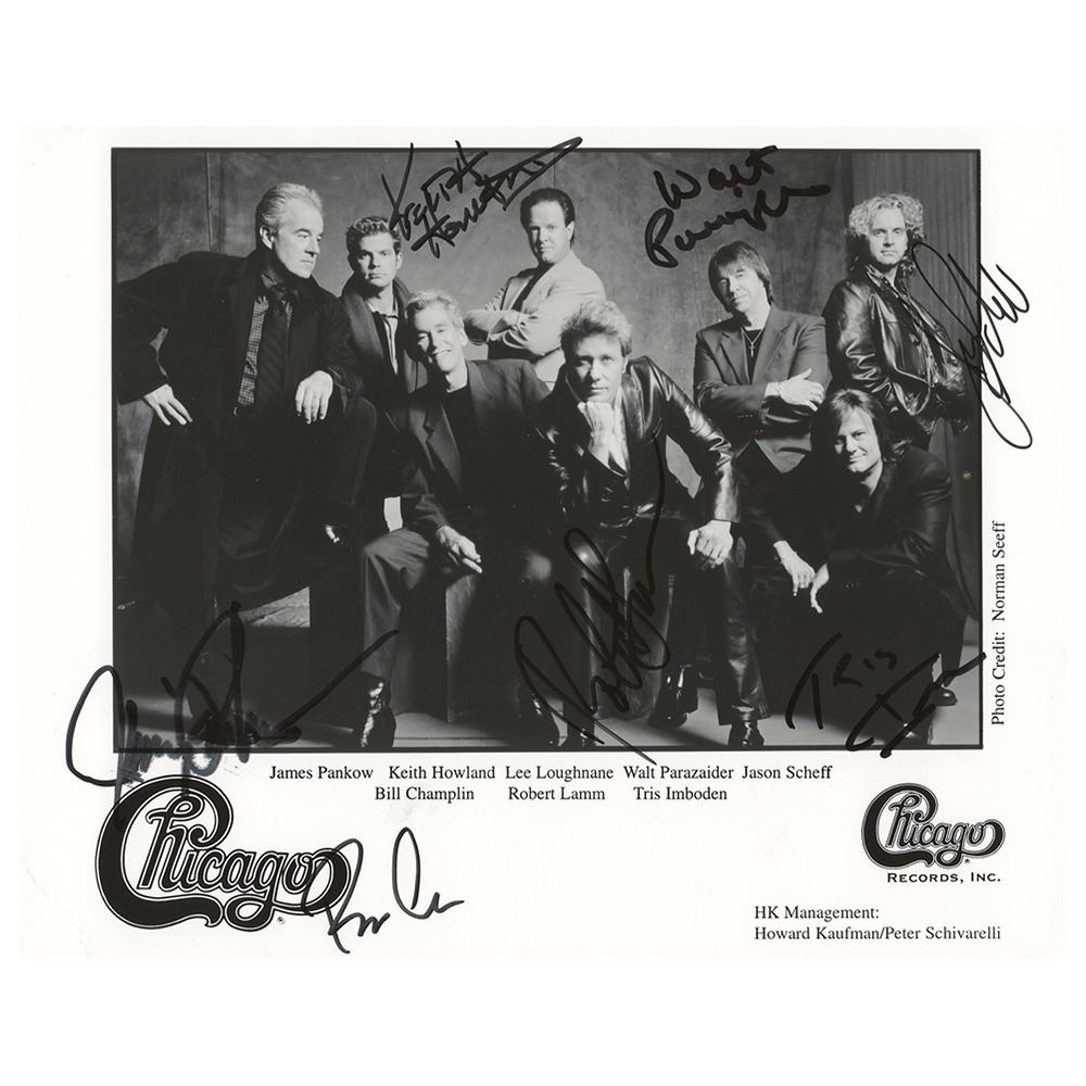 Satin-finish 10 x 8 Chicago Records publicity photo of the band by Norman Seeff, signed in black felt tip by James Pankow, Keith Howland, Robert Lamm, Tris Imboden, Walter Parazaider, Bill Champlin, and Jason Scheff. In fine condition, with some light feathering to Pankow's signature.