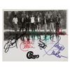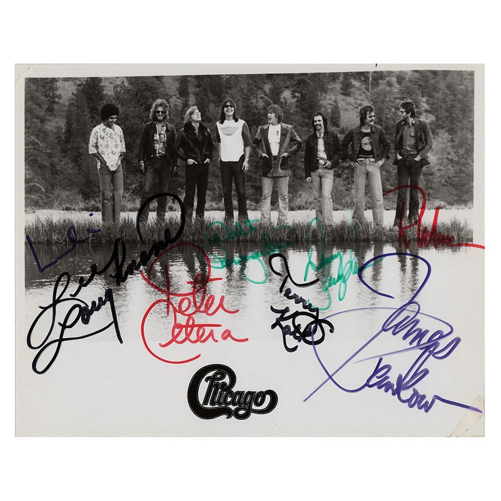 Desirable glossy 10 x 8 promotional photo of Chicago posing next to a lake, signed in multicolored felt tip by the full band: Peter Cetera, Terry Kath, Robert Lamm, Lee Loughnane, James Pankow, Walter Parazaider, Danny Seraphine, and Laudir de Oliveira. In fine condition, with small pieces of clear tape at the corners.