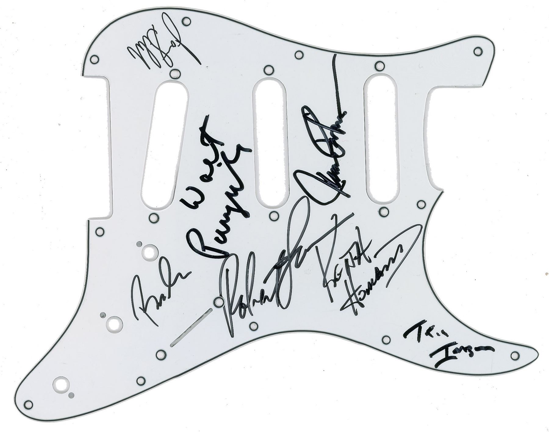 White Stratocaster-style pickguard, signed in black felt tip by seven members of Chicago. In fine condition.