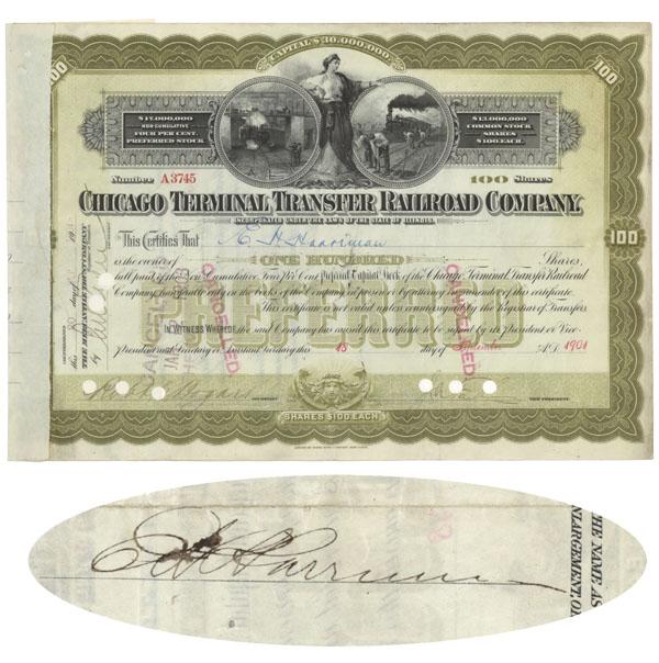 1901, Illinois. Stock certificate for 100 shares of the Chicago Terminal Transfer Railroad Company. Olive/Black. Engraved vignette of standing liberty flanked by steam locomotive scenes. Issued to and signed on verso by EDWARD H. HARRIMAN,(1848 - 1909). Railroad executive, Financier. One of the great railway builders of all time, Harriman was known for his genius in developing and reinvesting in railroads. His stock market battle for control of the Northern Pacific against the combination of J. Pierpont Morgan and James J. Hill (which ended in a standstill) remains as one of Wall Street's great wars. A true financial wizard, Harriman was known as the "Napoleon of Wall Street" and upon his death, "controlled more millions of capital than any financial giant of the country." A highly attractive and scarce Harriman variety. Punch cancellations not affecting Harriman’s signature. Fine.