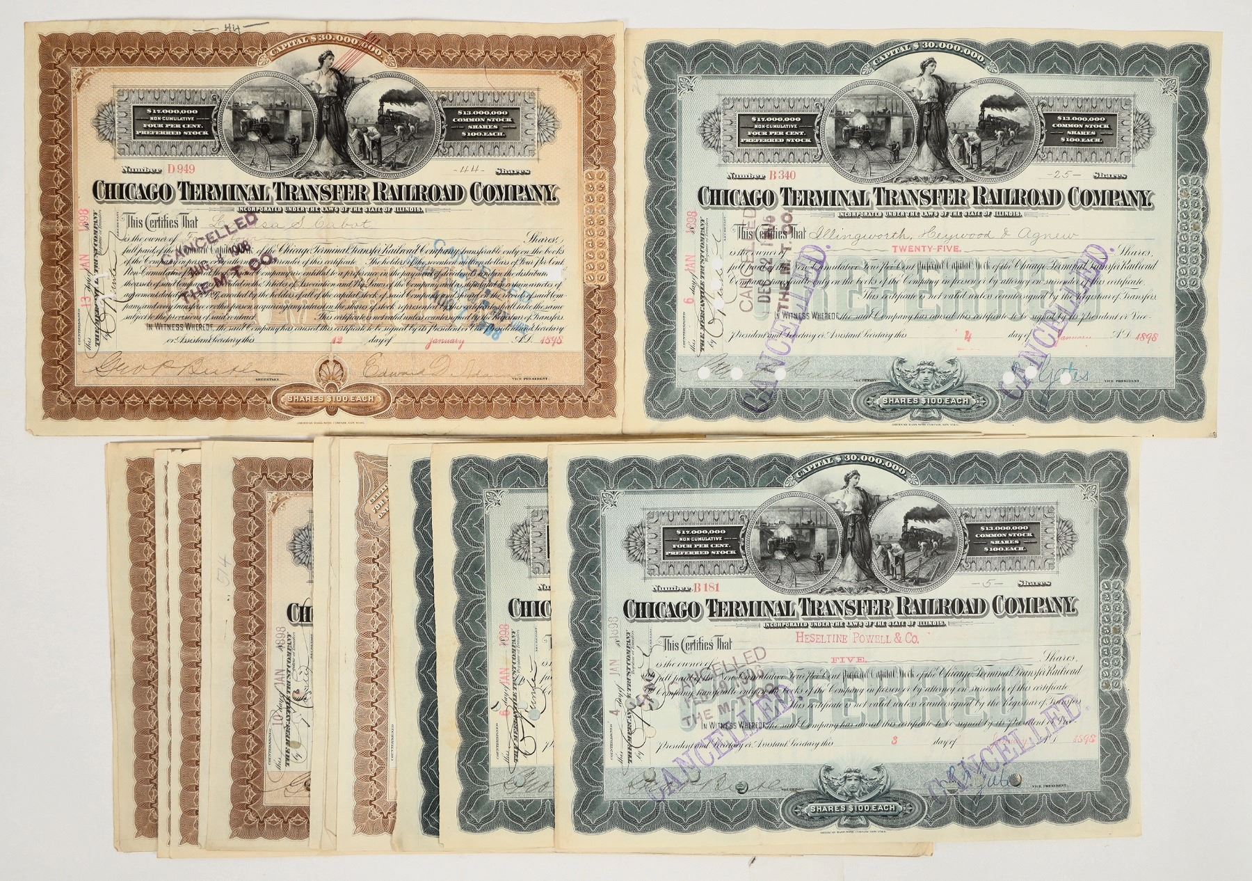 Group of 15 stock certificates from the Chicago Terminal Transfer Railroad Company, issued 1898 to 1907. All issued, all cancelled using ink stamp cancellations. Lot includes brown and turquoise varieties of the certificates. Excellent vignettes of railroad workers and locomotives. 11.5"x8" certs, some light toning/soiling; see photos.