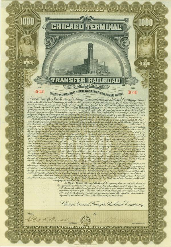 1897, New York. $1000 bond bearing 4% interest. Olive/Black with olive overlay. Vignette at top center of terminal. Stamp cancelled. Very fine.