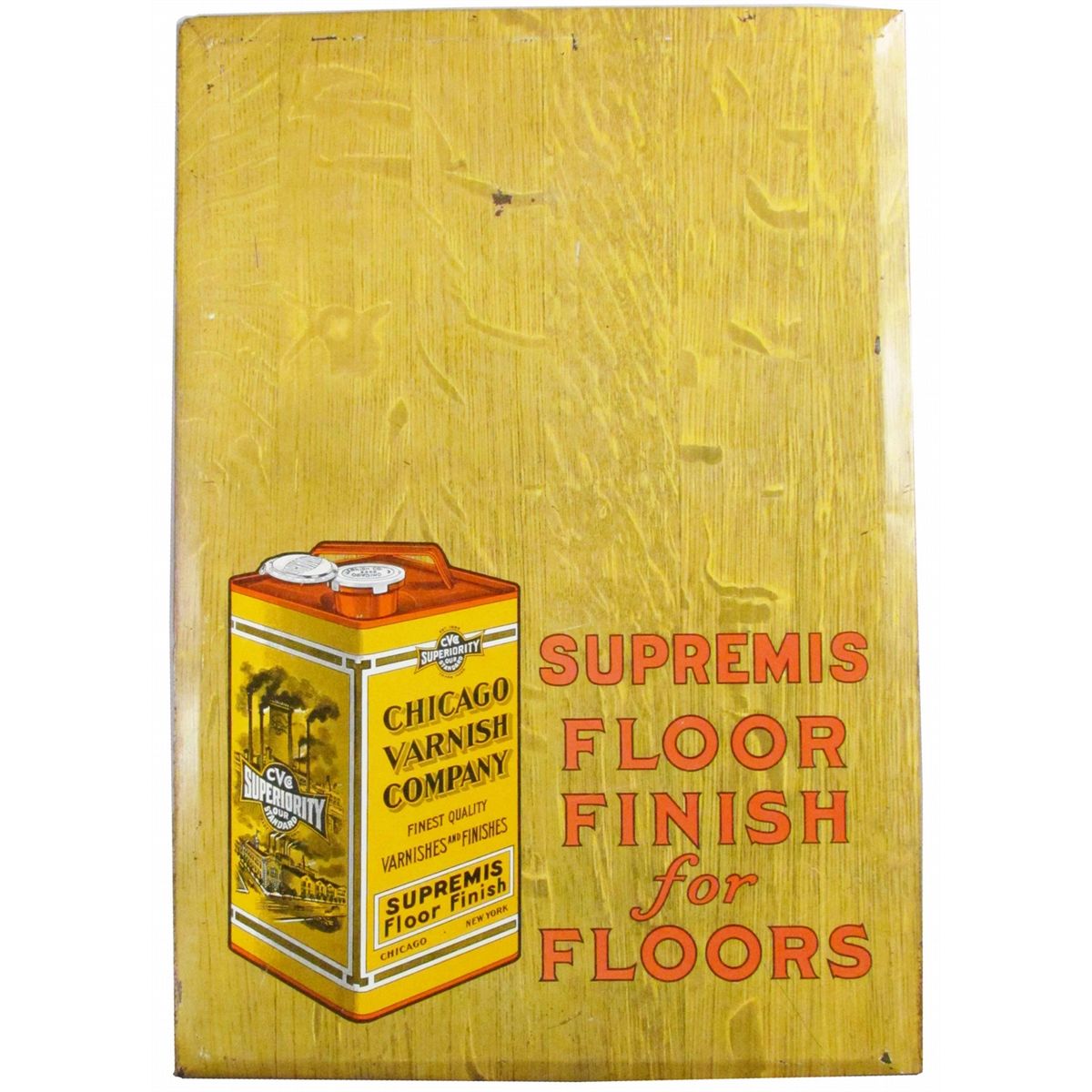 Chicago Varnish Company Self Framed Tin Over Cardboard Easel back/String Hanging Sign. Supreme Floor Finish. Some minor scratches otherwise good condition. 13 X 19 inches.
