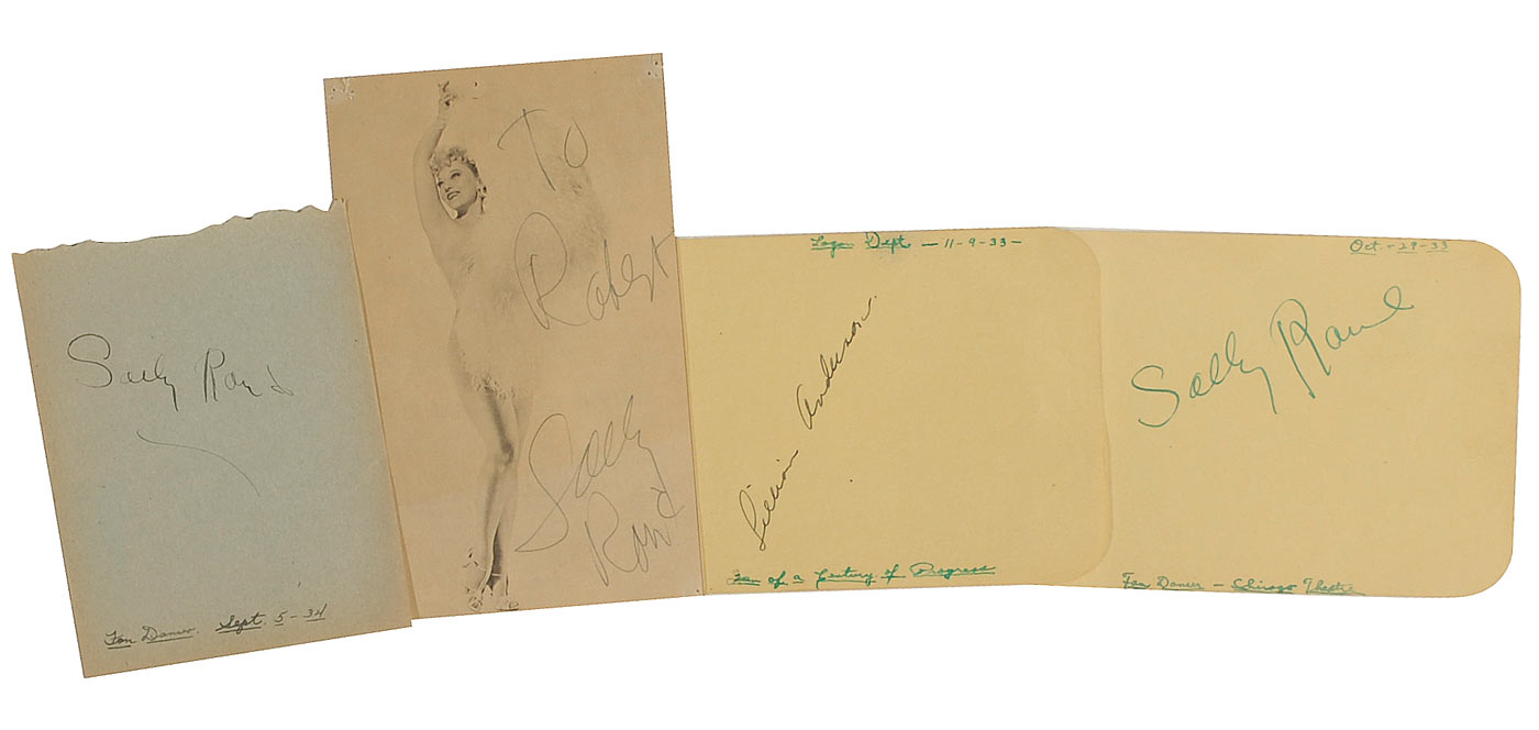 Four items: three fountain pen signatures, two of Sally Rand and one of Lillian Anderson on individual album pages; and a 4.25 x 6.75 promotional flyer for an appearance by Rand at the Petroleum Club in Texas, signed and inscribed in fountain pen “To Robert, Sally Rand.” In overall very good condition, with several pin holes and a central horizontal crease to the photo and edge toning and collector notations to the album pages. According to the consignor, the signatures were originally obtained at the 1933-1934 Century of Progress in Chicago.