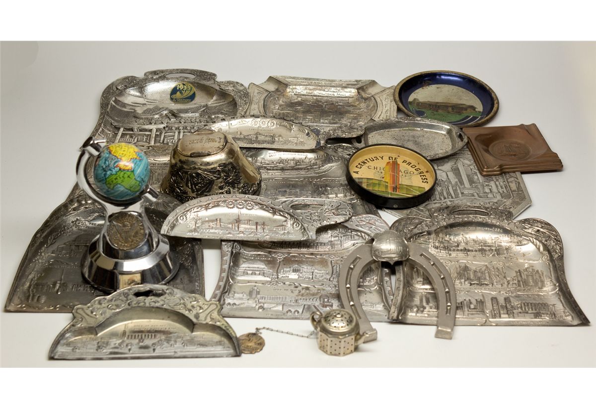 Lot of 18 pieces, mostly silvered metal and imported by N. Shure Co. 1) 6 assorted large crumbers, 6 x 6,” and 3 assorted small crumbers; 2) 3 ash trays, one painted, one copper, one silvered; 3) miniature tea caddy shaped like a teapot; 4) horseshoe paperweight with Hall of Science shield; 5) small bucket with tray; 6) round colored ash tray, 4,” with painted Rutledge Tavern from the Lincoln Exhibit at the Century of Progress, 1933; 7) octagonal 5 x 5” pressed paper hot plate; 8) world globe paperweight, with Chicago World’s Fair 1893-1933 plaque, 5” tall. Base swivels to reveal pictures of the various exhibit halls. -60067