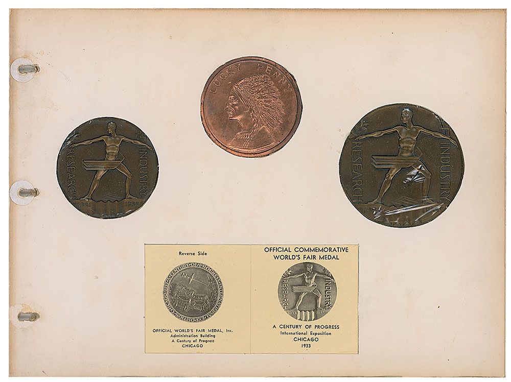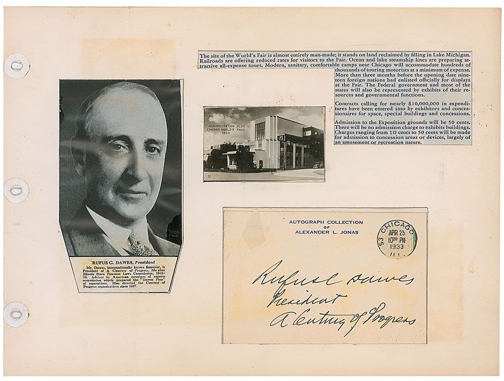 Impressive scrapbook bearing an affixed ‘Century of Progress’ logo affixed to the front, 12 x 9, containing ten signed items from notables associated with the 1933 Chicago World’s Fair, primarily consisting of letters and cards. The items are inlaid into the scrapbook pages along with a variety of mementos from the event. Signers include: Anton Cermak, Edward J. Kelly (2), Rufus C. Dawes, Charles S. Peterson, Daniel H. Burnham, George Woodruff, Lenox R. Lohr, Lillian Anderson, and E. L. Blystone. Unsigned items in the scrapbook include snapshots, pins, covers, coins, and medals. In overall very good to fine condition.