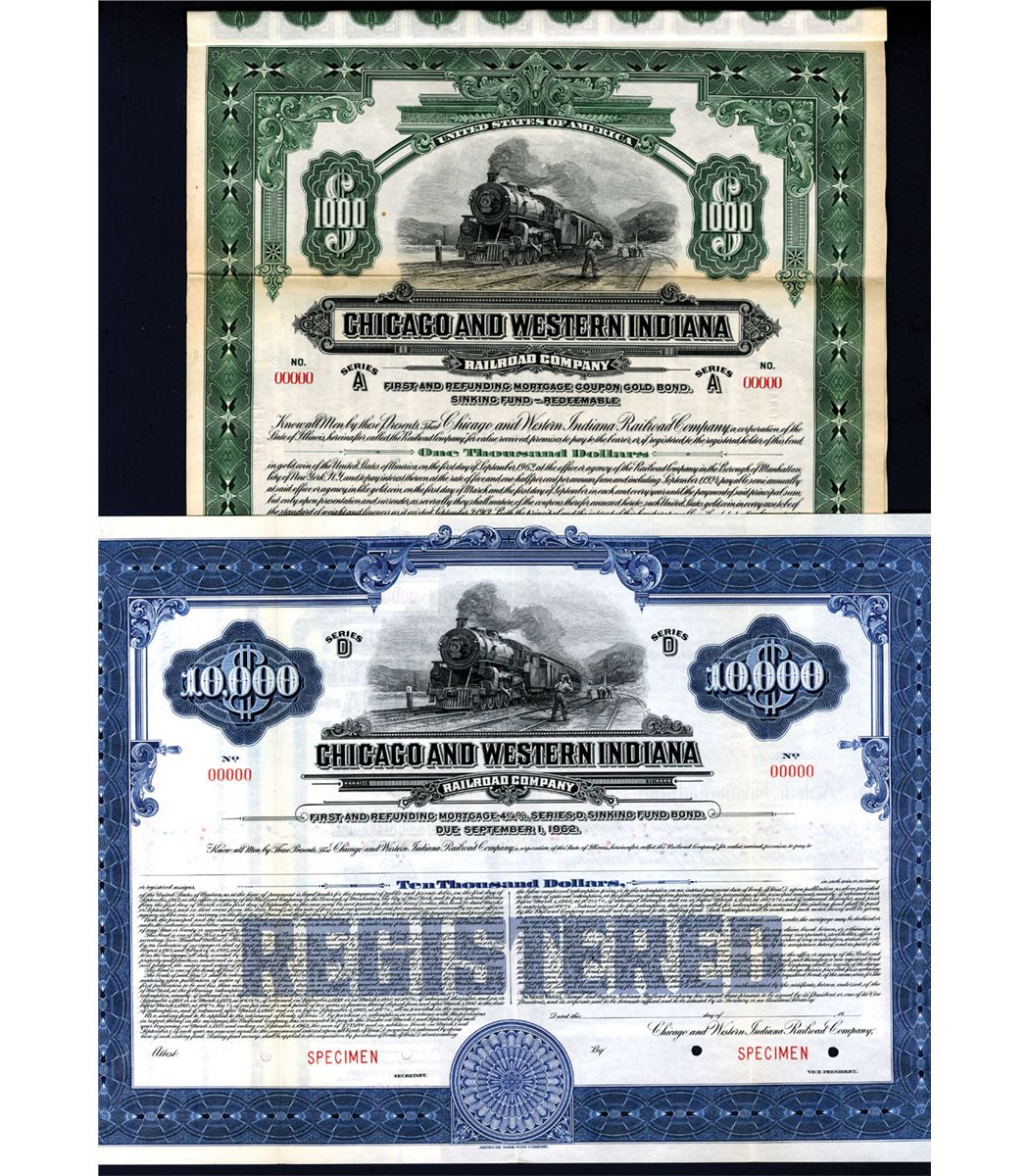 Illinois, Lot of 2 different Specimen bonds, Includes $10,000 Registered 1st & Refunding Mortgage 4 1/4% Series D, Gold Bond, blue border and $1000 1st & Refunding Mortgage 5% Series A, Gold Coupon Bond, green border, both with same vignette of locomotive R-L passing workers, VF to XF condition. Listed railroad but unlisted bond variety and dates in Cox. ABNC. Rare and very attractive.