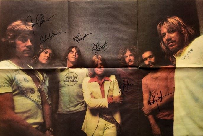 33 in. by 21.75 in. Chicago album insert poster autographed by Peter Cetera, James Pankow, Lee Loughnane, Walt Parazaider, Danny Seraphine, Robert Lamm and Terry Kath.