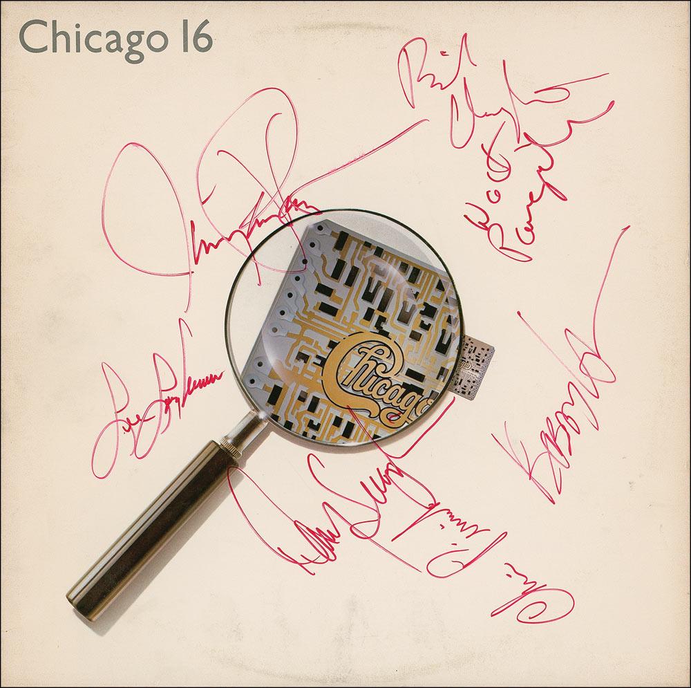 Chicago 16 album signed on the front in red felt tip by seven band members. In fine condition, with circular impression of light rubbing from the vinyl, light soiling, and edge wear. The record is included.
