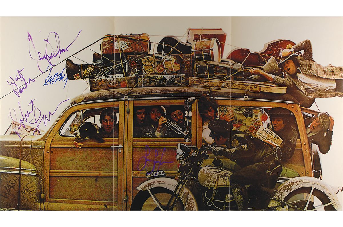 Color 36 x 20.25 poster of the band being pulled over in a woody wagon, originally included in the Chicago VIII album, signed in blue felt tip and purple ink by James Pankow, Walter Parazaider, Robert Lamm, Lee Loughnane, and Peter Cetera. In fine condition, with original folds.