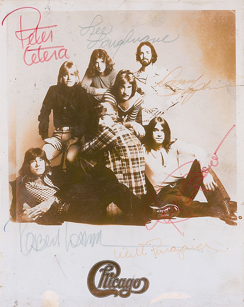 Glossy 8 x 10 group photo, signed in various color felt tip by Terry Kath, Robert Lamm, Walter Parazaider, Peter Cetera, James Pankow, Danny Seraphine, and Lee Loughnane. In good condition, with scattered creases, surface loss near bottom edge, a couple signatures. Light but legible, and Kath’s signature very faded and barely distinguishable.