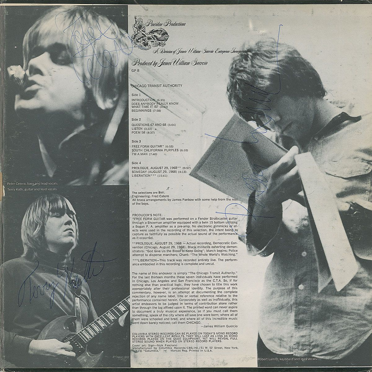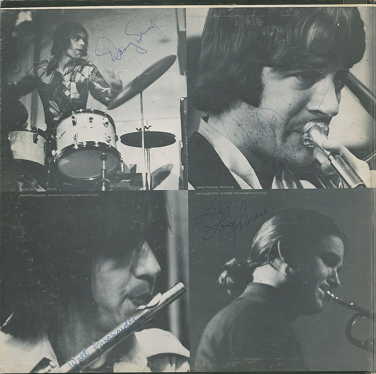 Chicago Transit Authority album signed on the inside gatefold in blue ballpoint by Terry Kath, Peter Cetera, Robert Lamm, Lee Loughnane, James Pankow, Walt Parazaider, and Danny Seraphine. In very good condition, with scattered surface wear to gatefold, and moderate ‘rings of wear’ and surface rubbing to both covers. The record is included. Accompanied by a full letter of authenticity from Roger Epperson/REAL, as well as four candid photos from an early Chicago concert.