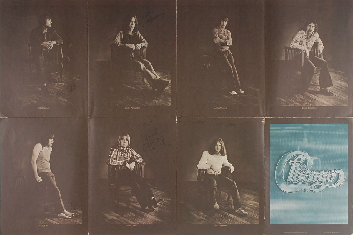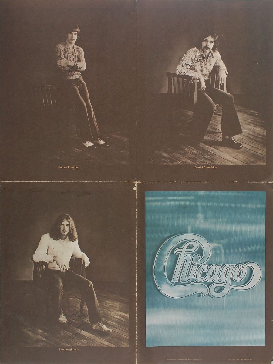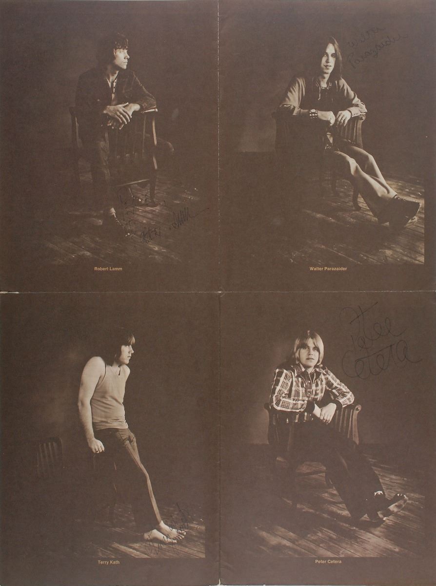 Vintage Columbia Records poster featuring images of Chicago’s founding members, 33 x 22, signed in black felt tip by all seven, each signing over his image. Signers are: Terry Kath, Robert Lamm, Walter Parazaider, Peter Cetera, James Pankow, Danny Seraphine, and Lee Loughnane. In fine condition, with trivial creasing, a couple slight edge separations to original storage folds, and moderate contrast to most signatures against the dark background. The poster was released in 1970 to promote the release of Chicago II. As Kath passed away in 1978, fully signed examples from the founding members are exceedingly scarce.