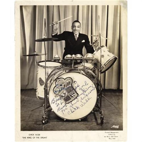 <B>Chick Webb Signed Photo.</B></I> A vintage b&w 8" x 10" photo of the "King of the Drums," inscribed and signed by him in blue ink. In Fine to Very Fine condition with moderate toning, and mild creasing and wear to the edges and corners.<BR><BR><b>Shipping:</b> Flat Material, Small (<a target="_blank" href="http://www.heritageauctions.com/common/shipping.php">view shipping information</a>)