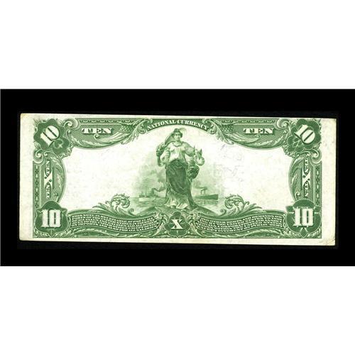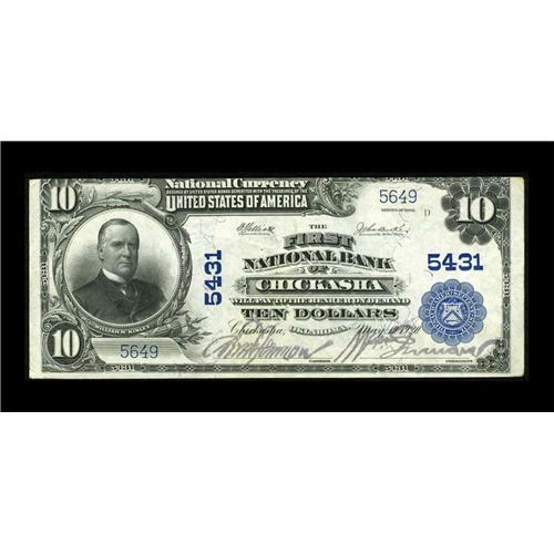 <B>Chickasha, OK</B></I> - $10 1902 Plain Back Fr. 633 <B>The First NB</B></I> Ch. # 5431<BR>This new to the census $10 Plain Back is <B>About Uncirculated,</B></I> with a single pinhole near the center and a slightly cut in upper margin. While we doubt this note ever actually saw any circulation, an internal bend and minor evidence of careless storage leads us to assign the conservative grade we have. Bidders may elect to value this bright and fully crisp note at a level higher than our purely technical grade might imply. We take note of the fact that no other $10 Plain Back in the census is listed at a higher grade. The stamped signatures remain strong and fully legible.