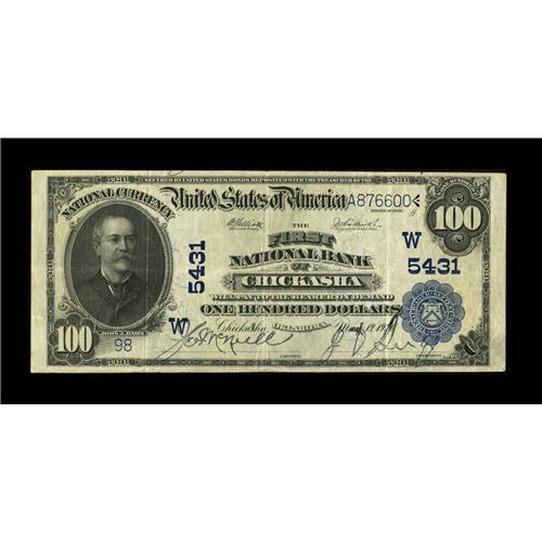 <B>Chickasha, OK</B></I> - $100 1902 Plain Back Fr. 705 <B>The First NB</B></I> Ch. # (W)5431<BR>A most attractive example which is one of just three large hundreds recorded from here in the Kelly census. Nice <B>Very Fine+,</B></I> with clear signatures.<BR><BR><b>Shipping:</b> Coin/Currency (<a target="_blank" href="http://www.heritageauctions.com/common/shipping.php">view shipping information</a>)