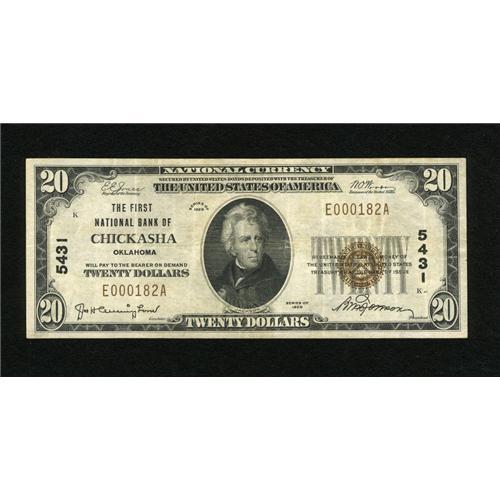 <B>Chickasha, OK</B></I> - $20 1929 Ty. 1 <B>The First NB</B></I> Ch. # 5431<BR>Though a trifle flat, this issue still boasts uncompromised paper and solid details. <B>Very Fine.</B></I><BR><BR><b>Shipping:</b> Coins & Currency (<a target="_blank" href="http://www.heritageauctions.com/common/shipping.php">view shipping information</a>)