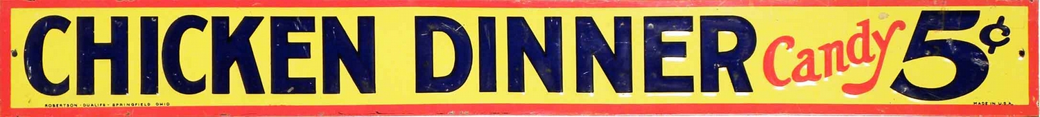 Chicken Dinner Candy Embossed Tin Screen Door Strip. A couple of scratches on the 5 otherwise very good condition. 22 X 2 5/8 inches.