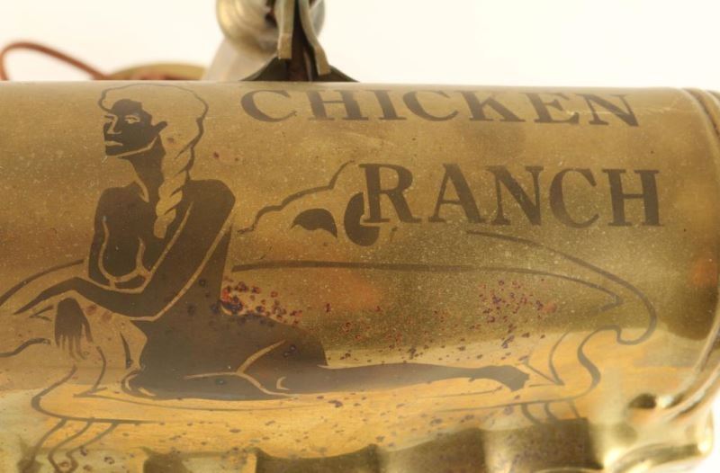 All brass construction with brass shade that reads "Chicken Ranch" with a lovely lady on a sofa. Has a 1927 date.
