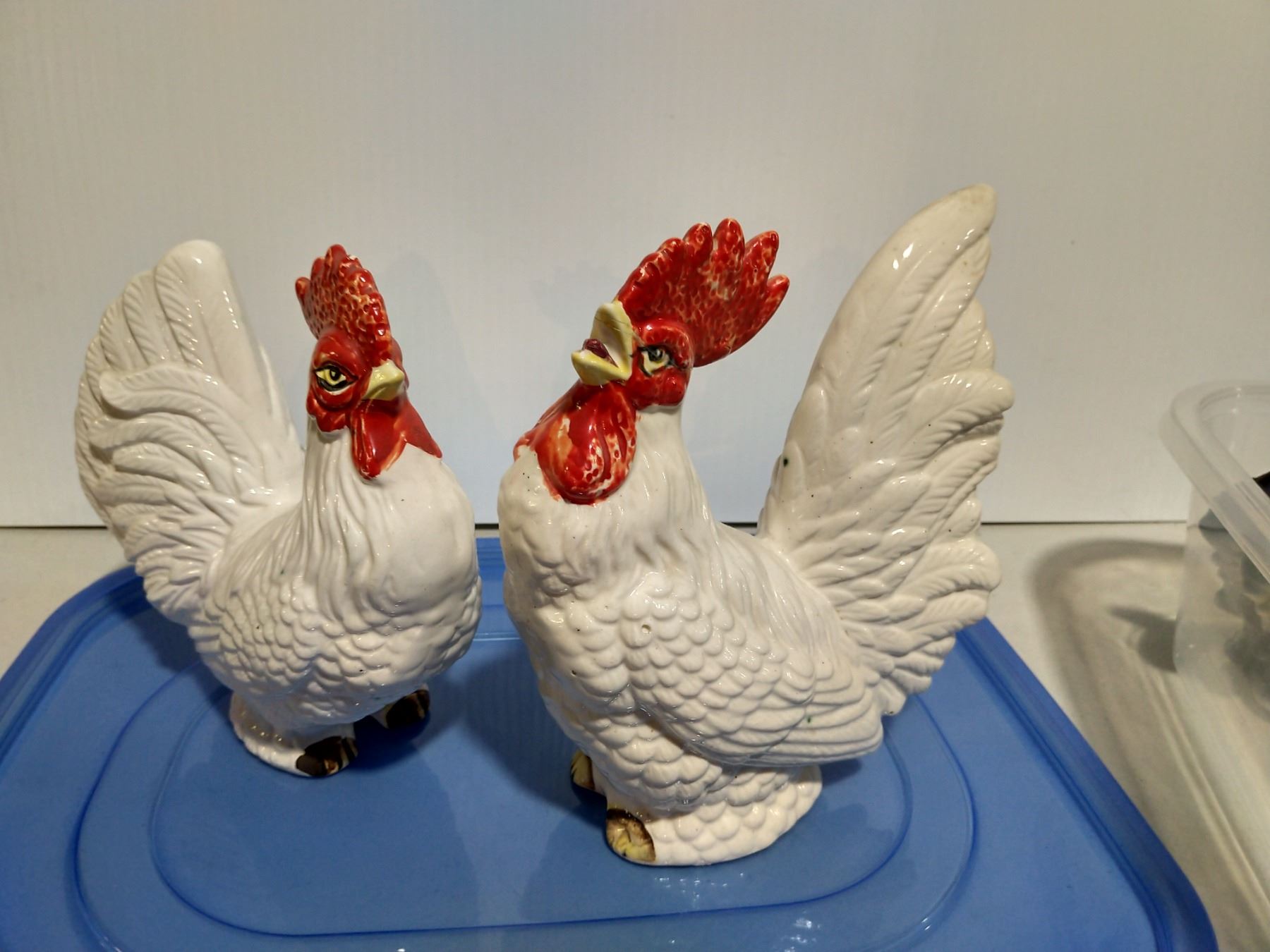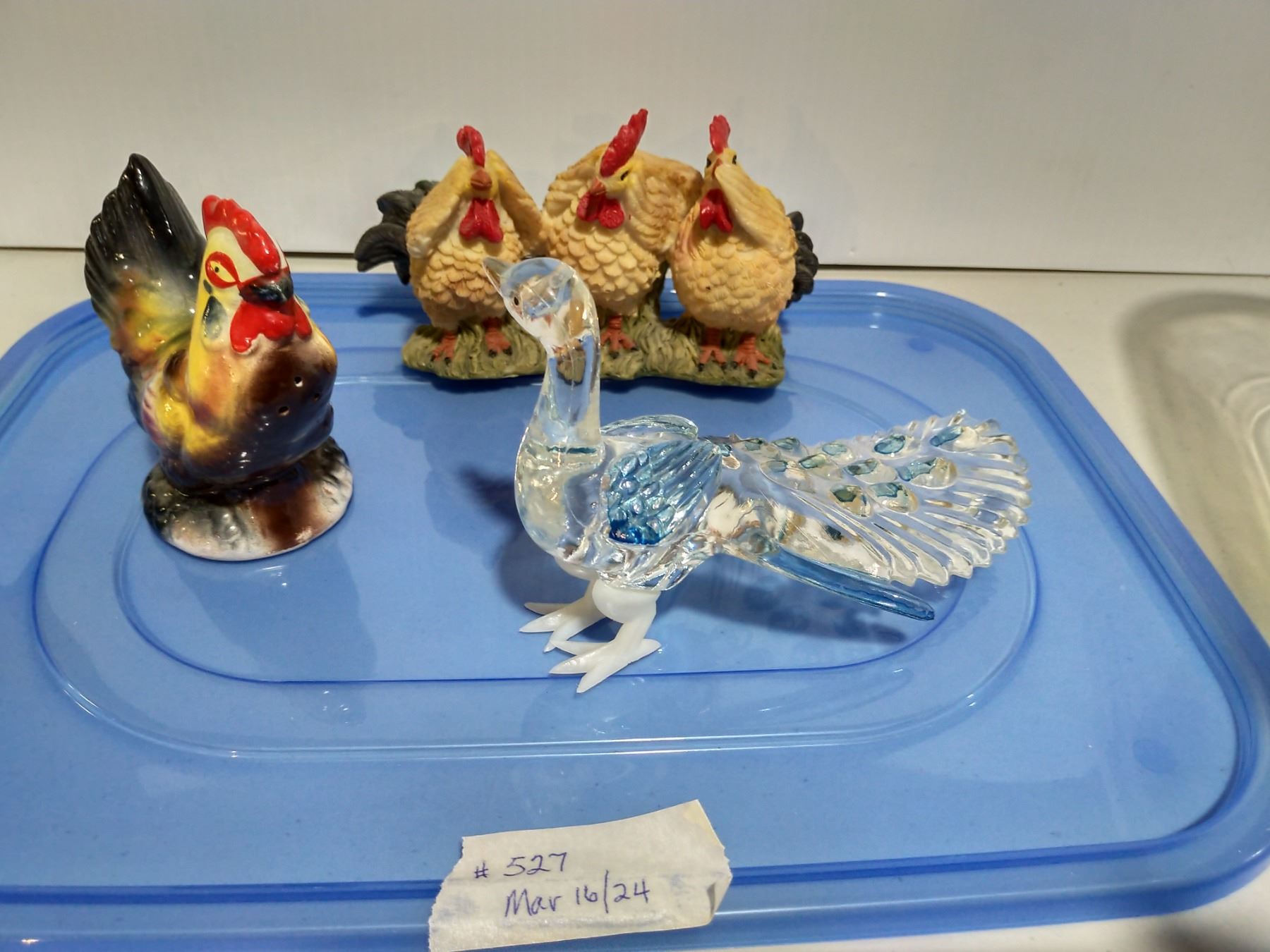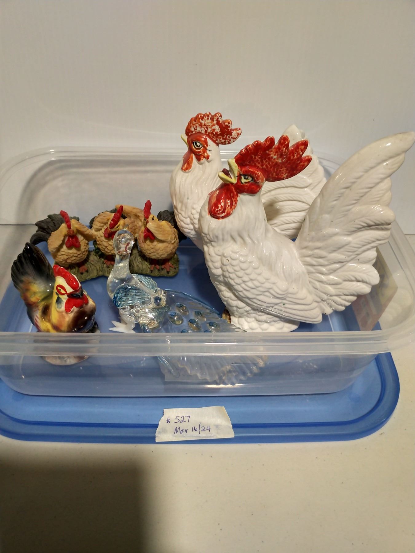 Chicken and bird ornaments in storage containers
