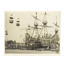 (Disneyland, c.1960s) A rare black and white photo of Disneyland's Chicken of the Sea "Pirate Ship Restaurant" in Fantasyland. Above the restaurant, the original style of "Skyway" buckets can be seen overhead before they were given a more rounded shape. Measuring 8"x10", the photo is in very good condition with minor wear.
