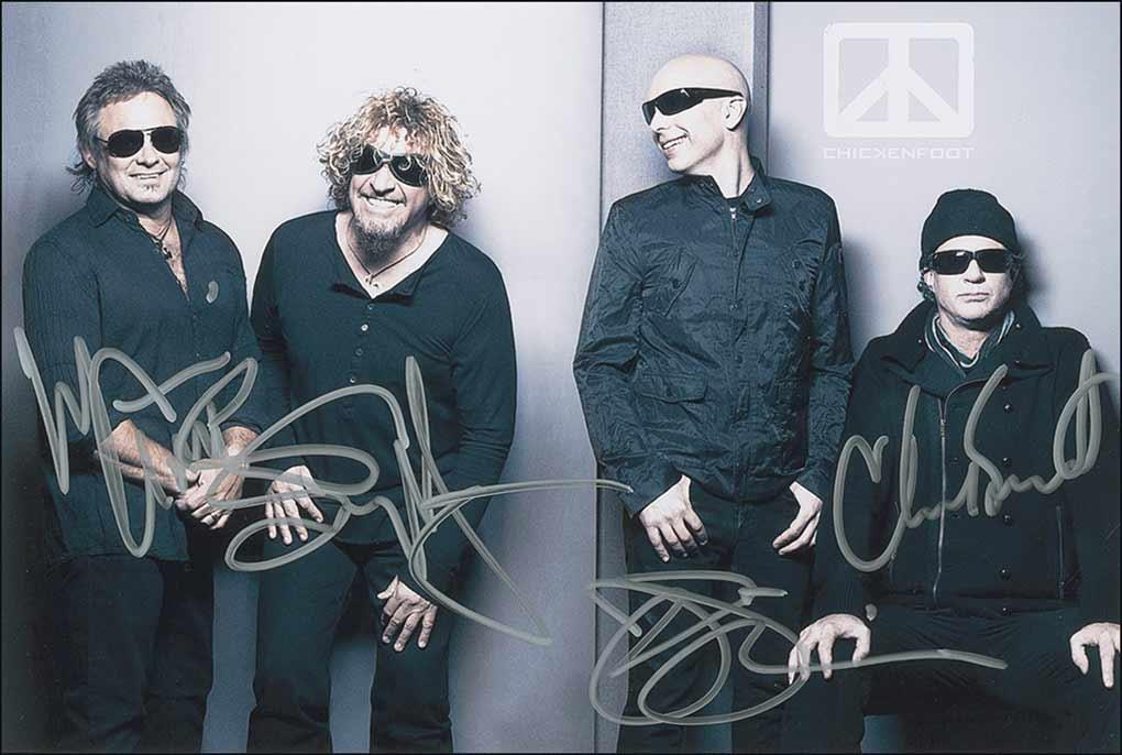 Color glossy 12 x 8 group photo, signed in silver ink by Sammy Hagar, Joe Satriani, Michael Anthony, and Chad Smith. In fine condition, with a small crease to left side, as well as several fingerprints to left edge.