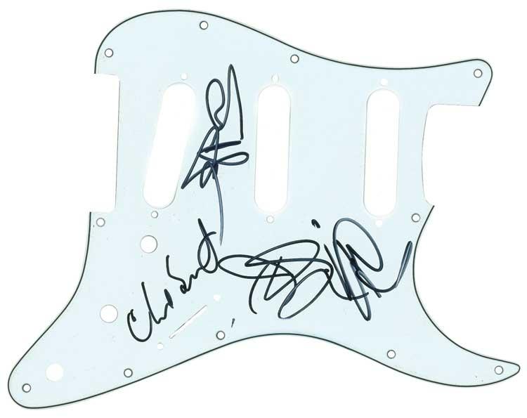White pickguard for a standard-size Stratocaster, signed in black felt tip by all four members: Sammy Hagar, Joe Satriani, Michael Anthony, and Chad Smith. In fine condition. RRAuction COA.