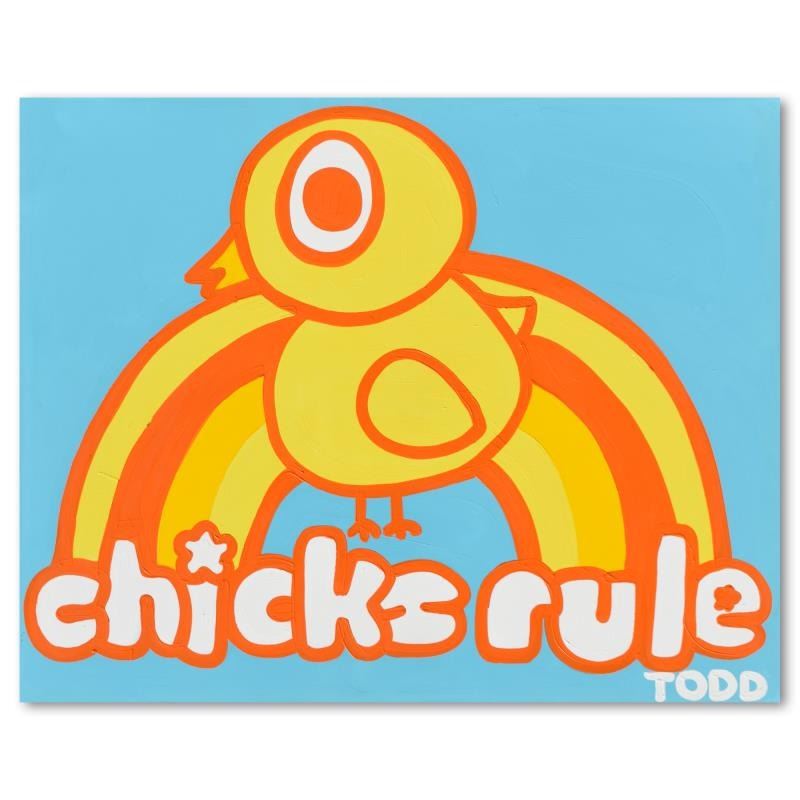 "Chicks Rule" is an original acrylic painting on gallery wrapped canvas by Todd Goldman, hand signed by the artist. Includes Letter of Authenticity. Measures approx. 60" x 48" (image). Due to the way this piece was stored there may be minor wear or signs of age (such as wear on the corners) but the piece is in overall good condition.