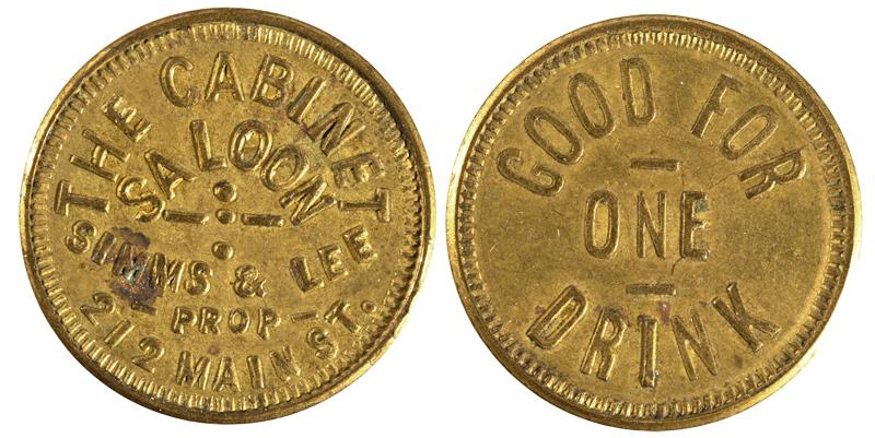 Obverse: The Cabinet / Saloon / Simms & Lee/ Prop / 212 Main St. ; reverse: Good For / One / Drink. Br, 21mm, R6. Very fine condition, some dirt on obverse.