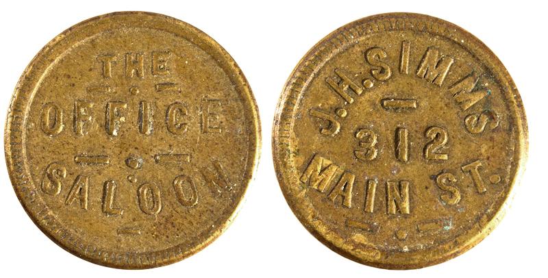 Obverse: The / Office / Saloon; reverse: J. H. Simms /312 / Main St. Br, 23mm. Extremely fine condition.