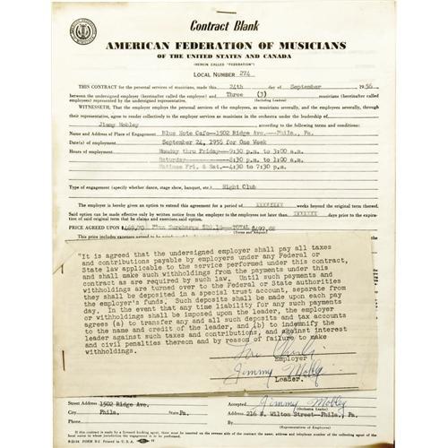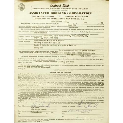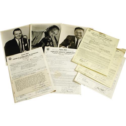<B>Chico Hamiliton and Others Contracts with Photos.</B></I> Includes a set of three agent=signed contracts for Chico Hamiliton, dated February 10, June 21, and October 10, 1956; an agent-signed contract for J.J. Johnson (July 25, 1956), and a Jimmy Mobley-signed contract (September 24, 1956), all for performances at the Blue Note. Also included are b&w 8" x 10" photos of Hamilton, Johnson, and Kai Winding. In overall Very Fine condition with some instances of wear, creasing, and/or areas of mild discoloration.<BR><BR><b>Shipping:</b> Flat Material, Small (<a target="_blank" href="http://www.heritageauctions.com/common/shipping.php">view shipping information</a>)