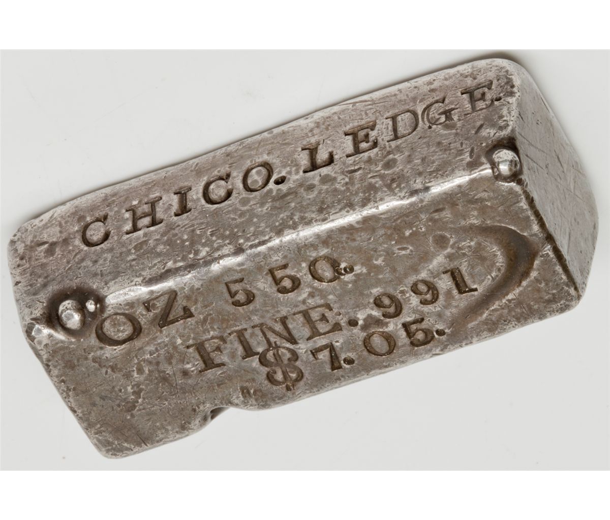"There are three different mines carrying the Chico name in the Western US through about 1873. One is in Arizona, and another in New Mexico. Both are principally gold mines. The only silver mine with the Chico name is a fairly well known silver mine or prospect in the Unionville area, near the Star and Buena Vista districts. The Echo mining district contained approximately 75 different lodes in 1863-1865, second only to the Humboldt district located nearby. The Humboldt area was one of the most remote mining districts in Nevada Territory and in the west in general. It is so remote that Unionville and Star City, the two major mining camps that housed up to 1000 miners and prospectors at one time, was never canvassed by any of the early directory companies. Sam Clemens was there in 1861-1862, and staked several claims with his brother and friends. His hilarious stories about the are can be read in "Roughing It" published in 1875, under his pen name Mark Twain. The Chico prospect was once owned by John Bidwell, a California pioneer who came to California in 1841, and went to work for John Sutter. He became Brigadier General of the California Militia in 1863, and founded Chico, California. This ingot was most likely an exhibition ingot used in conjunction with high grade ore specimens from the mine. Both were probably shown off in San Francisco around 1863, a common practice for mining companies (as was the Chico) who were trying to raise money. The lack of an Internal Revenue tax stamp indicates an early period of manufacture before the bullion tax law was emplaced" [Ref: HKA's Fall 2006 Ingot Catalog, page 60]. -59067