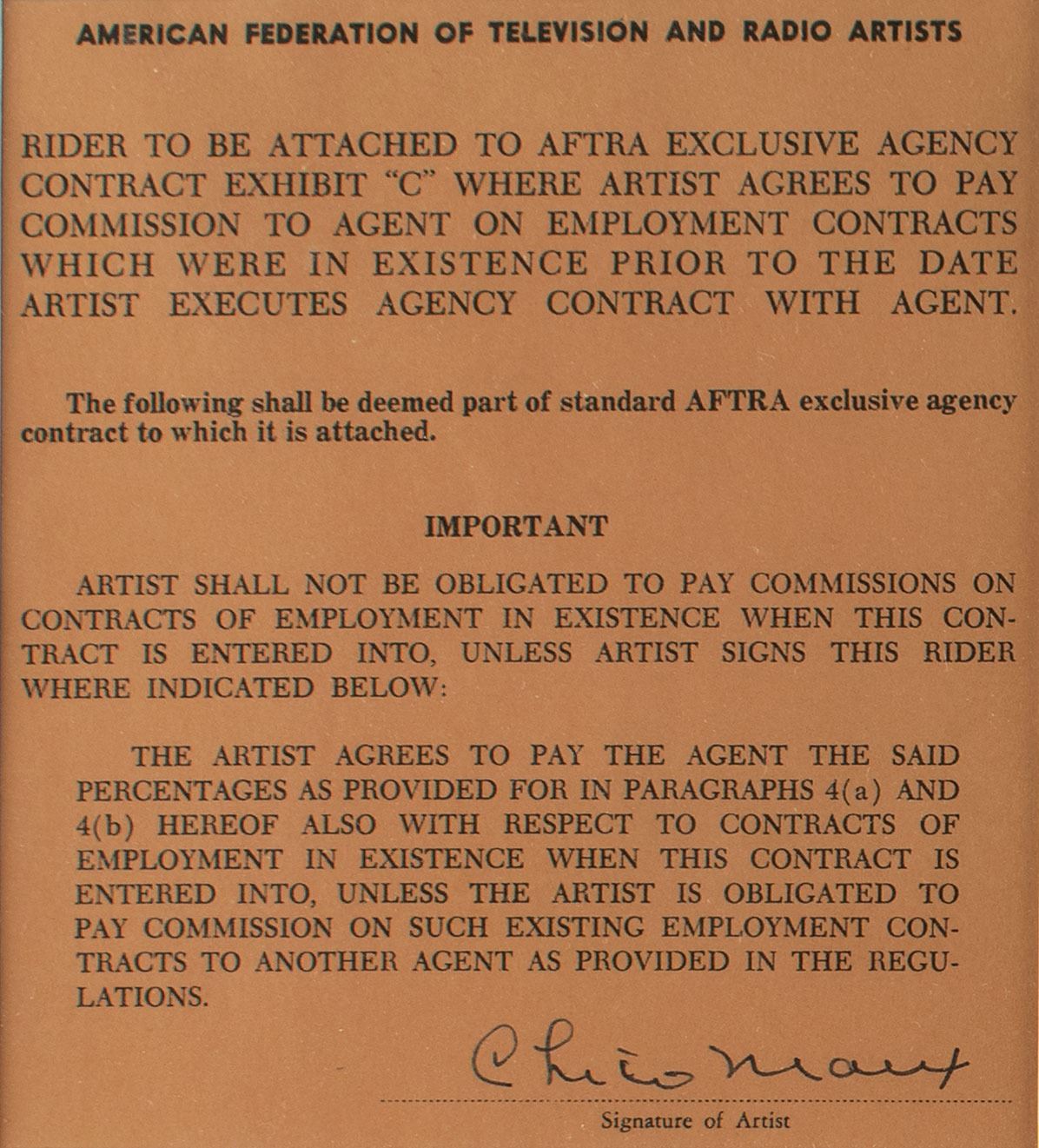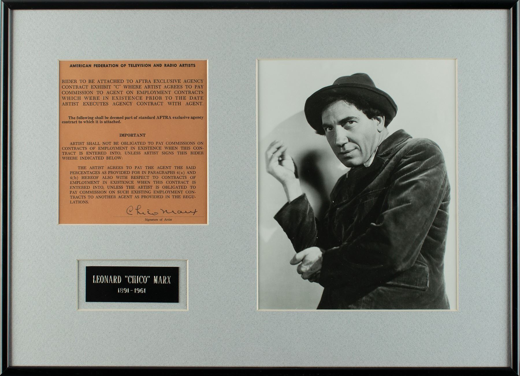 DS, one page, 5.25 x 5.75, no date. Rider for Exhibit 'C' of an AFTRA exclusive agency contract, with Chico Marx agreeing "to pay commission to agent on employment contracts which were in existence prior to the date artist executes agency contract with agent." Signed neatly at the conclusion in black ink by Marx. Matted and framed with an engraved plaque and a photo to an overall size of 18.25 x 13. In fine condition.