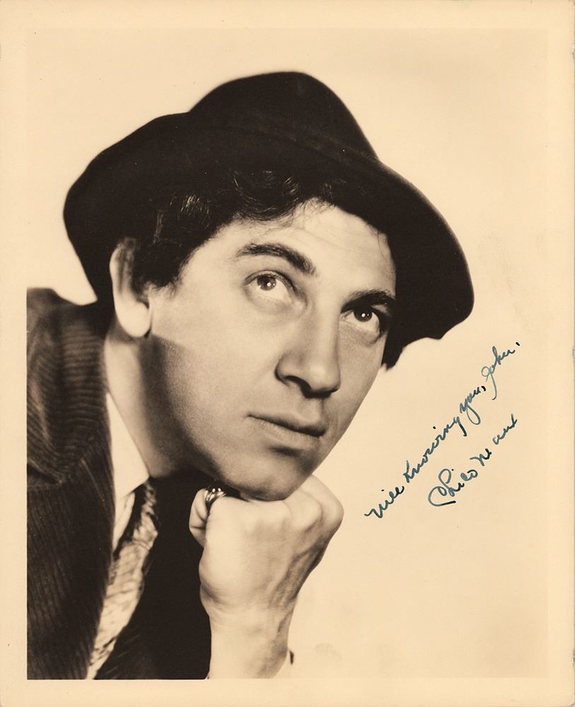Great vintage matte-finish 8 x 10 photo of Marx in a playful close-up pose, neatly signed and inscribed in fountain pen, "Nice knowing you, John, Chico Marx." In very fine condition.