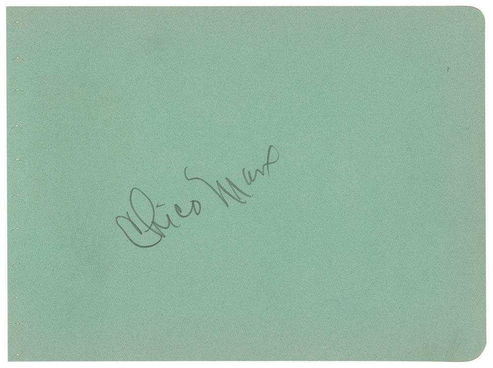 Vintage pencil signature, “Chico Marx,” on a green 6 x 4.5 album page. In fine condition, with faint show-through from an area of toning on the reverse barely touching the start of his signature and a few wrinkles.