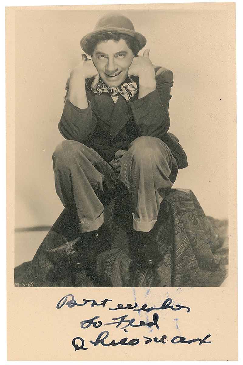 Vintage matte-finish 3.5 x 5.25 photo of Marx humorously resting his arms on his knees, signed and inscribed in the lower border in fountain pen, “Best wishes to Fred, Chico Marx.” In fine condition, with a few stray ink marks slightly affecting the inscription.