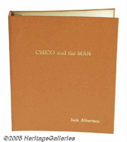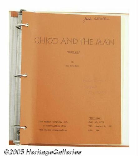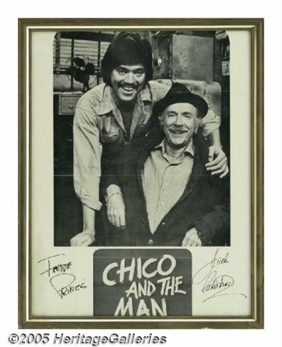 <B>"Chico and the Man" Signed Script and Photograph.</B></I> Soon after a successful appearance on "The Tonight SHow with Johnny Carson" in 1973, stand-up comedian Freddie Prinz was cast opposite character actor Jack Albertson in the sitcom "Chico and the Man." The show was a ratings success and Prinz was soon on the fast track to superstardom. Sadly, his personal life began to unravel just as fast, fueled by drug addiction and a failing marriage, and Prinz took his own life in 1977 at the age of 22. The showed limped on for another season before finally being cancelled. Featured here is Albertson's personal copy of the season two premiere episode "Paint Job" (aired September 12, 1975), signed by the actor, and a framed 11" x 14" black-and-white poster for the show with printed signatures. Excellent pieces of TV memorabilia, both items are in great condition. <I>With COA from PSA/DNA.</B></I>