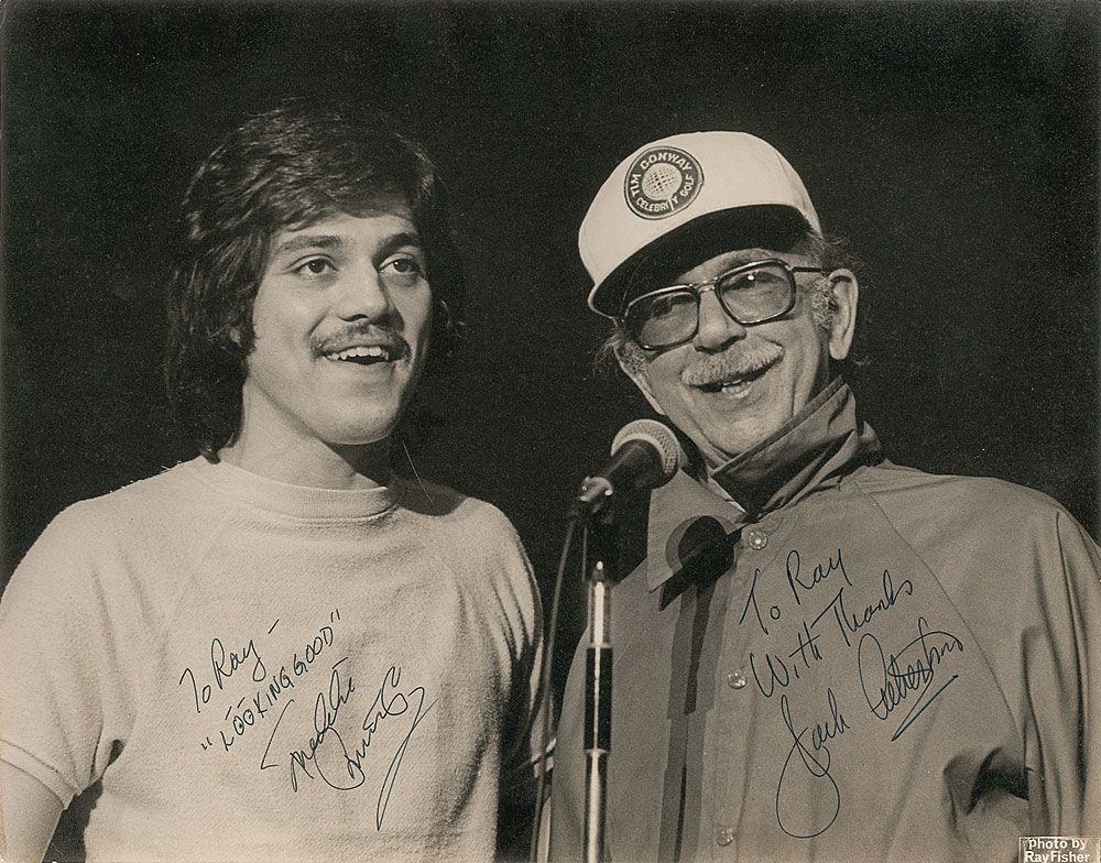 Matte-finish 14 x 11 photo of Freddie Prinze and Jack Albertson sharing a microphone, signed and inscribed in black felt tip, “To Ray—Looking good, Freddie Prinze,” and “To Ray, with thanks, Jack Albertson.” In fine condition, with a few light surface marks and impressions. Ray is probably the photographer, Ray Fisher.