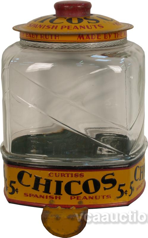 Chicos Spanish Peanuts Store Glass Container w/ tin lid & tin base wall mount holder