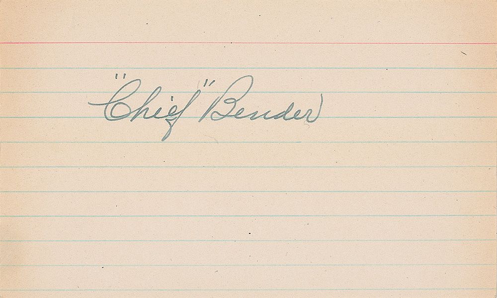Much-lauded baseball pitcher (1884–1954) inducted into the Hall of Fame in 1953, a year before his death. Vintage fountain pen signature, “‘Chief’ Bender,” on an off-white 5 x 3 lightly-lined card. In fine condition, with light toning.