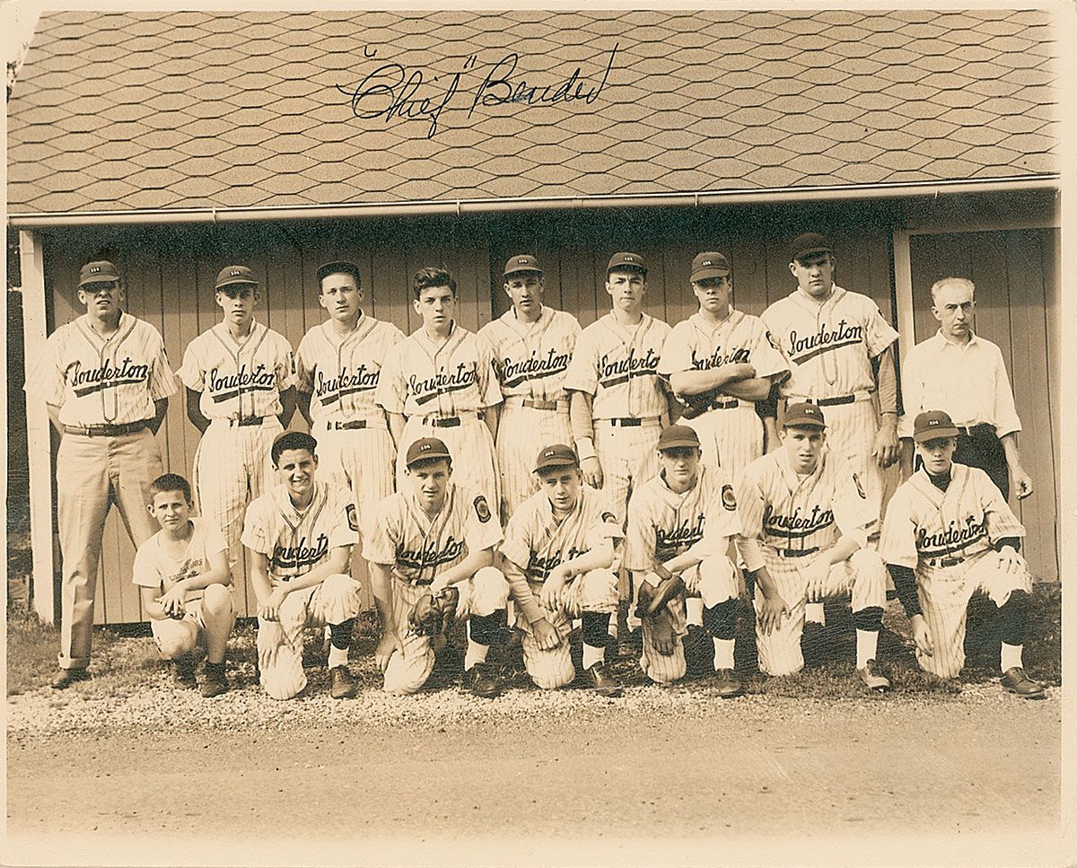 Pitcher (1884–1954) inducted into the Baseball Hall of Fame in 1953 after a career in which he won 212 games and pitched a no-hitter; he later mentored the baseball team of Pennsylvania’s Souderton School. Scarce vintage matte-finish 10 x 8 team photo of the Souderton baseball club, signed in fountain pen on the front and on the reverse, “‘Chief’ Bender.” In fine condition, with a few creases and mild rippling to edges. Accompanied by a full letter of authenticity from JSA.